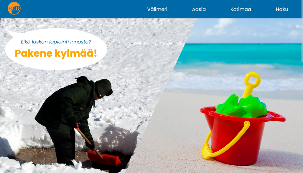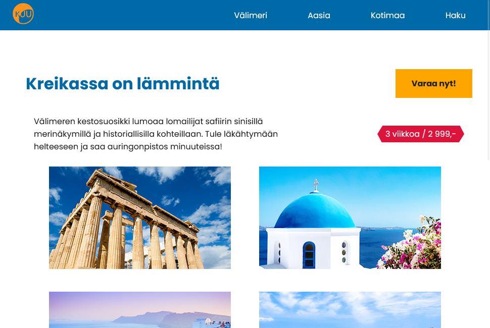 - mainin sisällä on div class="split" elementti, jonka tarkoitus on asemoida otsikko (h1) ”Kreikassa on lämmintä”