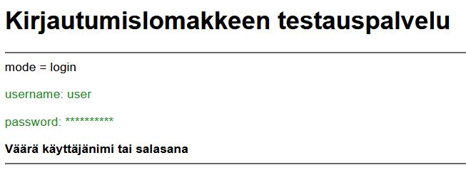 Kun lähetät lomakkeella onnistuneesti username, password ja mode=login (hidden filed) kenttien tiedot, sivuston tulisi näyttää käyttäjänimi, salasanatähdet ja kertoa oliko salasana oikein.