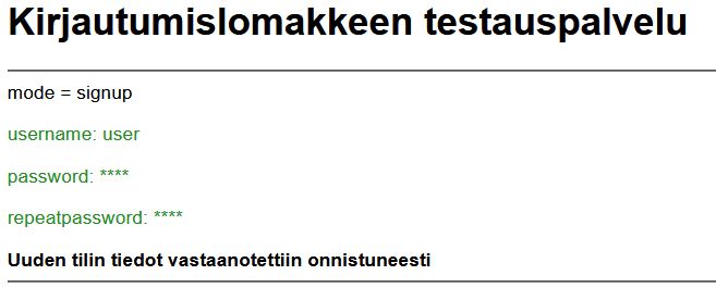 Kun lähetät lomakkeella onnistuneesti username, password, repeatpassword ja mode=signup (hidden filed) kenttien tiedot, sivuston tulisi näyttää käyttäjänimi ja molempien salasanojen tähdet.